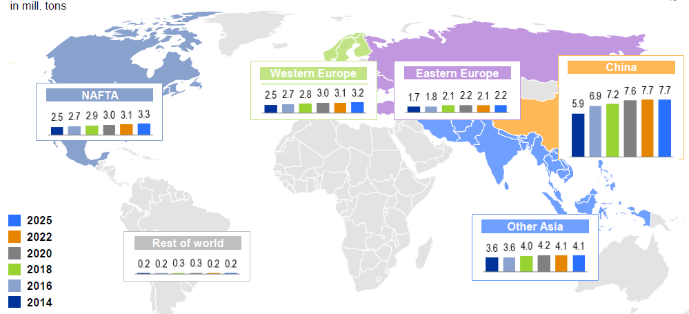 - The trend towards electrical vehicles and light-weight production induces a rising aluminum foundry production