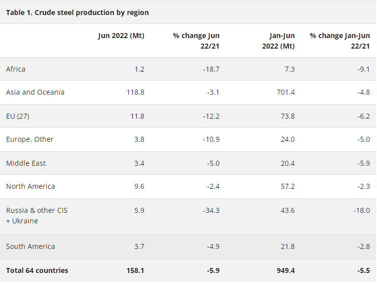 Africa produced 1.2 Mt in June 2022, down 18.7% on June 2021. Asia and Oceania produced 118.8 Mt, down 3.1%. The EU (27) produced 11.8 Mt, down 12.2%. Europe, Other produced 3.8 Mt, down 10.9%. The Middle East produced 3.4 Mt, down 5.0%. North America produced 9.6 Mt, down 2.4%. Russia & other CIS + Ukraine produced 5.9 Mt, down 34.3%. South America produced 3.7 Mt, down 4.9%.
