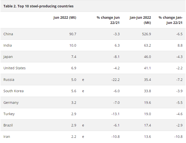 China produced 90.7 Mt in June 2022, down 3.3% on June 2021. India produced 10.0 Mt, up 6.3%. Japan produced 7.4 Mt, down 8.1%. The United States produced 6.9 Mt, down 4.2%. Russia is estimated to have produced 5.0 Mt, down 22.2%. South Korea is estimated to have produced 5.6 Mt, down 6.0%. Germany produced 3.2 Mt, down 7.0%. Turkey produced 2.9 Mt, down 13.1%. Brazil is estimated to have produced 2.9 Mt, down 6.1%. Iran is estimated to have produced 2.2 Mt, down 10.8%.