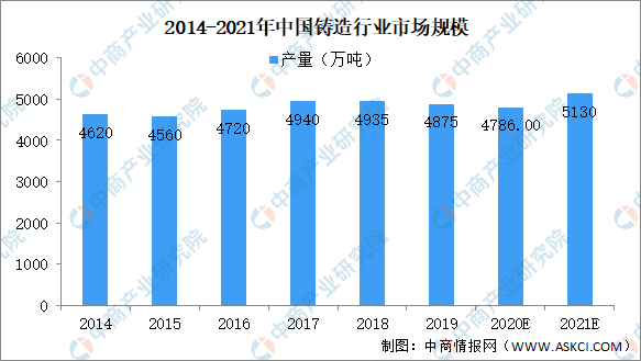 受宏觀經濟形勢下行影響,2015年我國鑄件十年來首次出現負增長,2016年產量重新恢復上漲,增速為3.51%,2017年為歷史高位,達4,940萬噸,同比增長4.66%,截至2019年底,我國鑄件總產量4,875萬噸。2014-2019年,我國鑄件產量呈現波動變化態勢,整體呈現中低速增長,行業產量仍處于較高的水平。受2020年受新冠疫情影響,鑄鑄造行業市場規模有所下降,將達4786萬噸。由于我國政府采取必要有效措施,預計2021年我國鑄造行業市場規模將有所回升,預計達到5130萬噸。