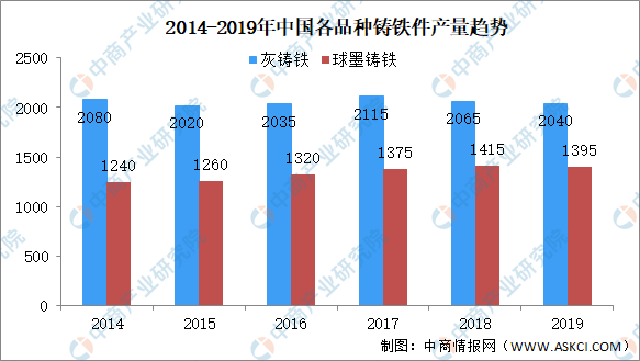 從不同材質鑄鐵件產量來看,2014-2019年灰鑄鐵產量整體維持在2,000萬噸以上;2014-2019年球墨鑄鐵產量從1,240萬噸增長到1,395萬噸,年復合增長率為2.38%。