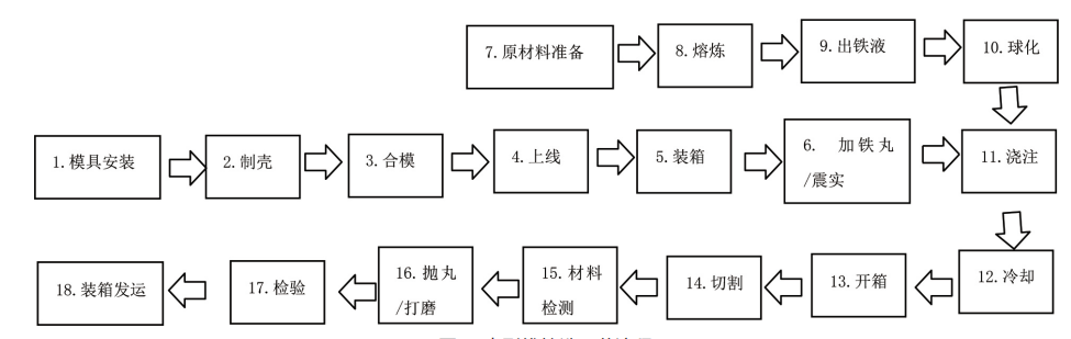殼型線鑄造工藝從模具安裝和原材料準備開始,到裝箱發(fā)運為止,具體流程如圖1所示。
