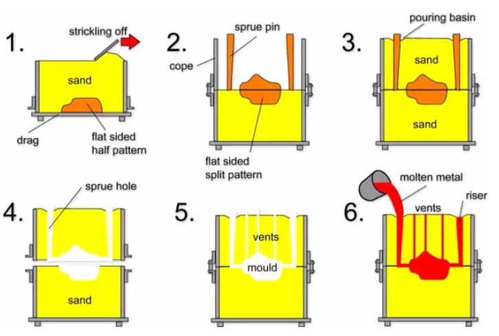 砂型鑄造:在砂型中生產鑄件的鑄造方法。鋼、鐵和大多數有色合金鑄件都可用砂型鑄造方法獲得。