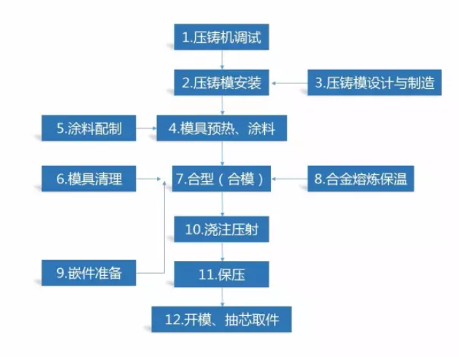 直接擠壓鑄造:噴涂料、澆合金、合模、加壓、保壓、泄壓,分模、毛坯脫模、復位;