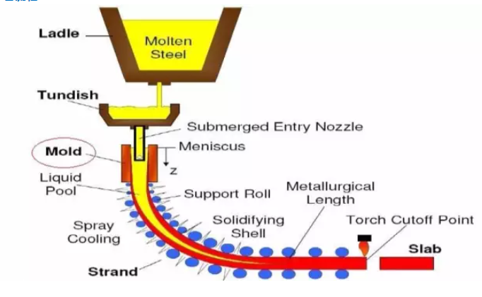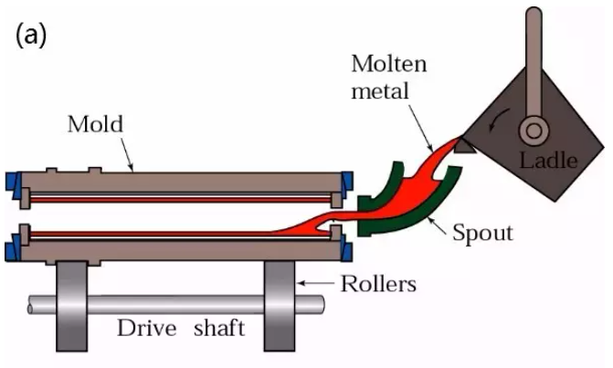 連續鑄造:是一種先進的鑄造方法,其原理是將熔融的金屬,不斷澆入一種叫做結晶器的特殊金屬型中,凝固(結殼)了的鑄件,連續不斷地從結晶器的另一端拉出,它可獲得任意長或特定的長度的鑄件。