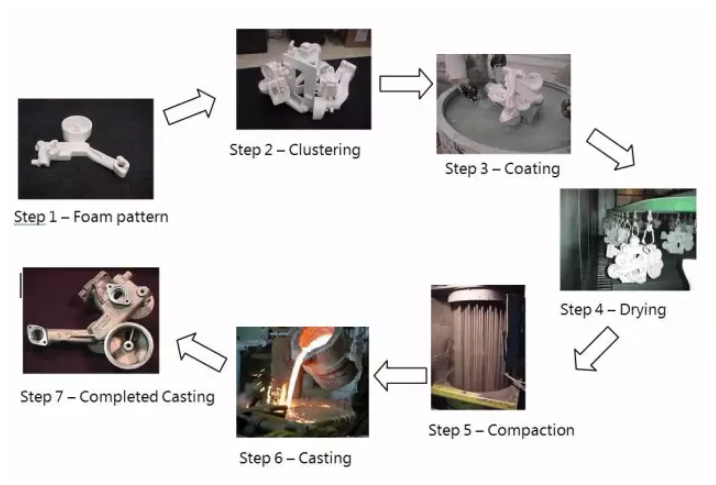 工藝流程:預發泡→發泡成型→浸涂料→烘干→造型→澆注→落砂→清理