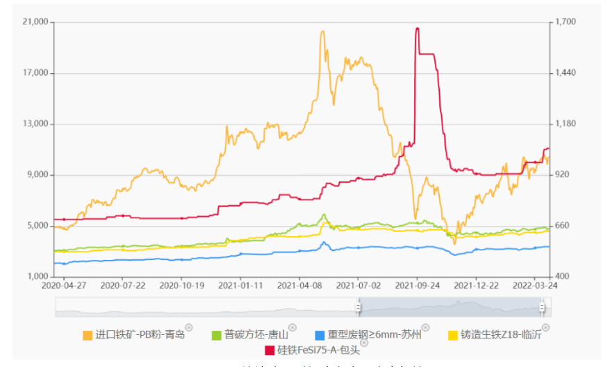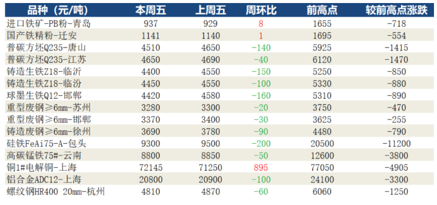 原料市場受鋼材降價(jià)、鋼廠利潤較低,需求偏弱等原因影響,本周價(jià)格整體呈穩(wěn)中下行趨勢,進(jìn)口礦現(xiàn)貨價(jià)格小幅震蕩,國產(chǎn)礦價(jià)格偏弱運(yùn)行,市場成交一般。鋼坯、廢鋼、生鐵價(jià)格均受鋼材大幅下跌影響緊跟下降,成交一般。鐵合金價(jià)格維穩(wěn)運(yùn)行,成交偏弱,商家多以觀望為主。銅鋁市場因國內(nèi)現(xiàn)貨供應(yīng)偏緊,價(jià)格保持中小幅上揚(yáng)。