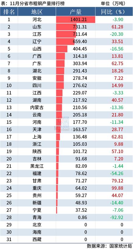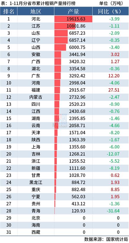 從分省數(shù)據(jù)來看,2022年前11月2個(gè)省市粗鋼產(chǎn)量同比降幅超10%。其中吉林降12.07%、和青海降31.64%。具體情況如下: