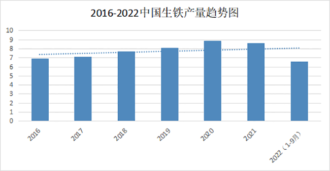生鐵是含碳量大于2%的鐵碳合金,是煉鋼、鑄造和各類鐵合金生產的主要原料。近十年中國生鐵產量呈先增,中間持平,再逐漸增加,到2020年達到最高,此后有所下滑。其中2022年1-9月中國生鐵產量為6.6億噸,累計下降2.5%。