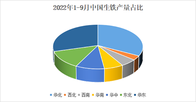 中國生鐵主要集中在華北、華東地區生產;2022年1-9月中國生鐵產量大區分布不均衡,其中華北地區產量最高,其中河北省占比23.17%。